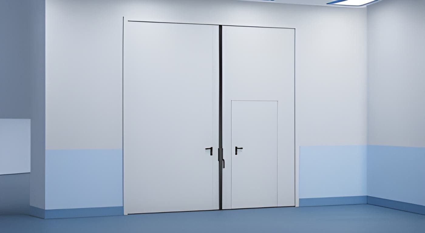 Две створки поставляются в сборе (сэндвич-панели толщиной 80 мм, стальные окантовочные профили, усиливающие уголки, петли со сменной осью, уплотнитель, ригельная задвижка, механический замок)